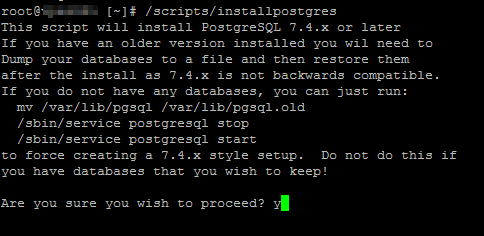 “This script will install PostgreSQL 7.4.x or later If you have an older version installed you will need to Dump your databases to a file and then restore them after the install as 7.4.x is not backwards compatible. If you do not have any databases, you can just run: mv /var/lib/pgsql /var/lib/pgsql.old /sbin/service postgresql stop /sbin/service postgresql start to force creating a 7.4.x style setup. Do not do this if you have databases that you wish to keep! Are you sure you wish to proceed?“